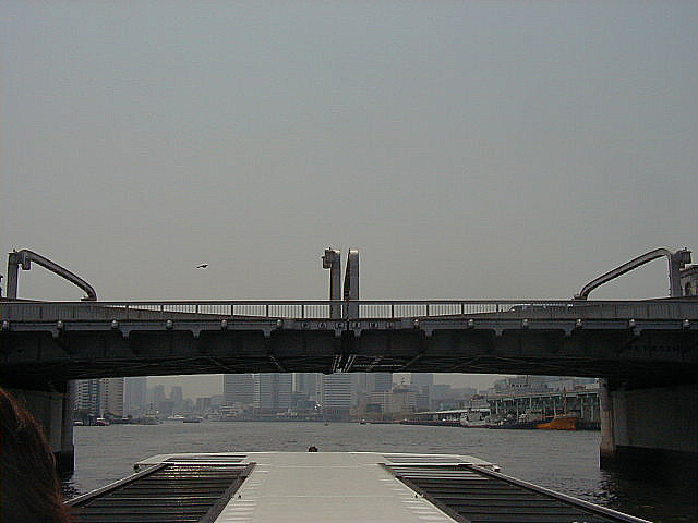 06 川下りも終盤です 中央のところから跳ね上がるんですよ。こんな感じ。 → _/ \_ 背の高い船が橋をくぐれるようにするためです。 もっとも、昭和45年/1970年を最後に、開閉はされていません。
