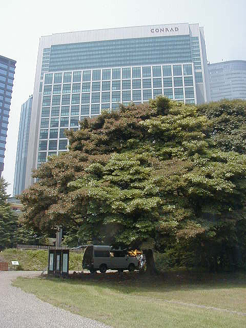 08 後ろは最先端・反対側は江戸の大名 「中の御門」の真後ろには「コンラッド東京」がそびえています。 浜離宮を見下ろす側の部屋は、最低でも1泊50000円はします。