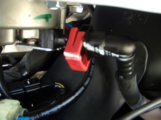 燃料ホースの下に雑巾などを引いた後、ジョイントロック(赤い部品)を外して燃料ホースを外します。 |