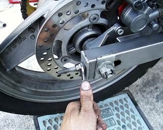 反対側のチェーンアジャスティングナットをスプロケ側の調整位置と同じになるように合わせる。