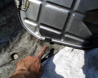 次にシート、グラブバー、シートカウルを外し、チューブと固定ボルトを外す。 |