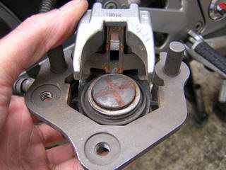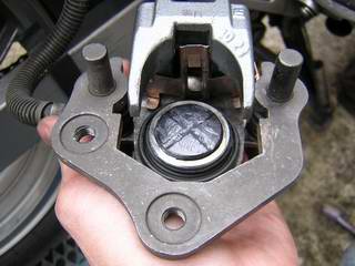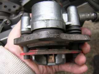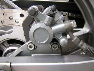 あとは六角レンチでキャリパの固定ボルトを外せばリアキャリパが外せます。 |