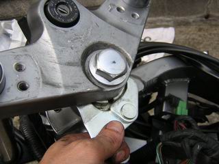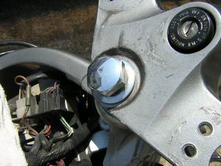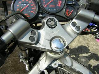 フォークを仮止めしてから、ステムロックナット、ステムヘッドボルトの本締め。ハンドルを切りながら”ハンドルがチョット重くなったカナ?”って辺りまで締めた後、ステムロックナットを緩めて調整します。 |