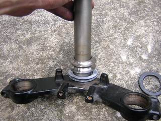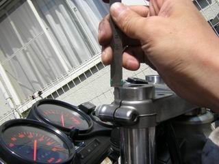 まずはステムロックナット、ステムヘッドボルトをで固定した後、フロントフォークの取り付け。この時にトップブリッジからの突き出し量をバラす前に測った値にあわせます。(私は左右12mmにしました)