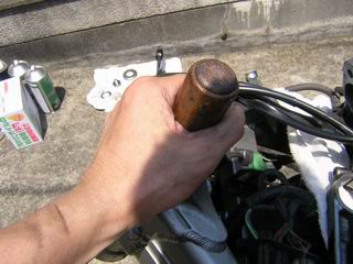 ベアリングプラーとかの専用工具が無いのでマイナスドライバーとハンマーでベアリングレースを外します。