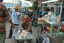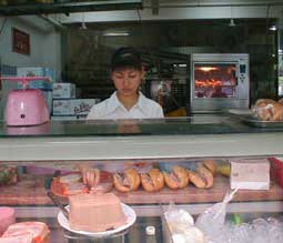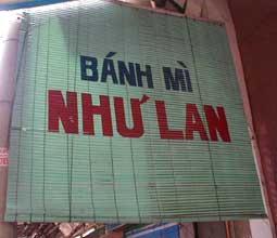 | バインミーというのが、ベトナムのフランスパンサンドイッチ。フランスパンにレバーペーストを塗って、ハムや大根と人参のナマスやハーブなどをはさんで食べます。ここ、ニューランは町中のバインミーの老舗。バケットそのものが、外がパリッと焼けていておいしいです。 |