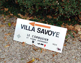 まずは、パリから車で約30分の POISSYの街へ。目指すのは、ル・コルビジエの建てたサヴォア邸。9月28日9:30、出発。日曜の朝で、車も少なく、コンコルド広場からシャンゼリゼを走り抜けて郊外へ快調に走る BMW。運転、うまいですよー!POISSYの街に入って探すこと数分。とにかく看板というか入口というか案内が、小さい。が、見つけました。コルビジェがサヴォア家のために建てた週末の家、ヴィラ・サヴォア。 |