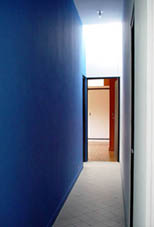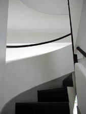 建てられたのは1929年。1931年からサヴォア家の人々が入居し、1940年まで住んだという。 全景を見渡せる広い敷地に、すきっと、この上なくシンプルにのびやかに、まるで、舞い降りた宇宙船のよう。円柱の上に置かれたような真っ白な建物。直線なのにやわらかい温かさ。屋上庭園と階段。モザイクタイルとキッチン。部屋から部屋へ通じる空間を鮮やかに塗り分けている色づかい。風景を切り取る横長の窓。どこからも自然光が入ってとても明るい。 今見ても充分未来的というshuさんの言葉に尽きる。 |