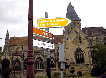 目指すのはファレーズ市の村に日本人アーチストによって修復された「林檎の礼拝堂」。 高速を160キロで快調に飛ばす。午後1時、ファレーズ市に到着。 しかし、がらんとした古い町です。日曜日のせいか、広場にも人はまばら。カテドラル、カフェ、レストラン、カーヴ。散歩する人と犬。あとは静まりかえった町。 |