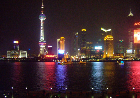 刻々クリアに瞬き出す浦東(プードン)の高層ビル(左の球形のタワーが東方珠テレビ塔、右にうっすらグランドハイアット)を見ながらの食事は贅沢の極みです。 土曜日でにぎわう夕方からのバンドを散歩。上海アールデコという20年代30年代の建物の石壁は下からライトアップされて幻想的な雰囲気。黄浦江の河辺は長く続く公園になっていて、デートコース。 |