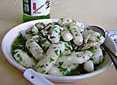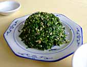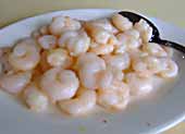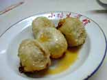 小籠包の他に青野菜と高野豆腐のような固めの豆腐を小さく切ってごま油で炒めてある前菜「馬蘭頭(マーラントウ)」。韓国のトックのようなお餅。上海在住の Iさんのおすすめで注文。(馬蘭頭(マーラントウ)とは辞書によるとコヨナメという植物らしい、とのこと)。 あとは別名「水晶海老」もおいしい。新鮮な海老をプリプリにゆでたシンプルな料理の上海名物。塩かげんが絶妙。 |