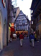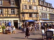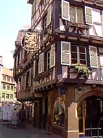 | アルザスはドイツとの国境近く、この100年の間に2回もドイツ領になったという複雑な土地柄です。ストラスブルグが一番大きな街ですが、ワイン生産地域を回るにはコルマールの方が便利ということでコルマールに滞在。街に入るとすぐ感じるのがこのドイツ的なテイスト。白壁に木組みの家。「コロンバージュ」というそうで、ボルドーともブルゴーニュとも違う、こじんまりと暖かみのある古い町並みです。私のアルザス滞在は2日だけでしたし、週末にもからんでいたので、ワイナリーやワイン屋さんはお休みのところが多く、街のカフェでのんびりのコースになりました。これが又、とてもいい。 |