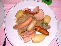 | アルザス料理というと、キッシュ・ロレーヌや、オニオン・パイ。それからシュークルート。ドイツ料理で有名なザワークラウトです。メニューもフランス語、ドイツ語、英語。古くからのお年寄りはフランスでもドイツでもない、アルザス語を話すとか。たとえ歴史に翻弄されたとしてもアルザスはアルザス。アルザス人の誇りをつらぬく気迫です。それとビール。アルザスはビールの産地。街のビアホールにはいくつもの種類の地ビールがおいてあります。でも名前がドイツ語チックで読めないのね。クローネンブルグもアルザスに本拠地があるそうで。イギリス、ベルギー、フランス、ドイツとビールはいろいろありました。 |