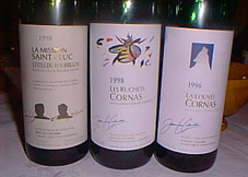 | 3日目はコンドリューの作り手、ドメーヌ・モンテイエとコルナスのジャン・リュック・コロンボを訪ねました。モンティエは走っても走っても建物らしきものもなく、まさかこの先にドメーヌがあるのかしらと不安になるほどの山の中。はるかになだらかな山々を望む丘の上の一軒家。農家のような入り口にリゴッタチーズあります、の看板。あ、ここだ、ここだ!よかった!見つかった!と一同ほっ。この日は viognerの収穫日にあたり、醸造家のステファンは大忙し。代わってママが対応してくれました。おおらかで、底抜けに明るい南仏のおっかさん。ここで待ってて!と案内された広々したお庭は山羊の放牧場でいたるところ山羊のふんだらけ。大きな声で笑いこけながらあちこち走りまわるママのあとをシェパードのサムが追いかけ、もうてんやわんやです。山羊を飼って、あのチーズ Rigotta de Condrieuを作ります。ステファンはハンサムでしょ、とママの息子自慢。サンジョセフ白、コンドリュー、Cuvee du Papy 98 とCote-Roti Granma をいただき、チーズも試食。真っ白なナチュラルとカビのついた熟成タイプ。どちらも絶品。特に熟成したシェーブルとコンドリューの相性は最高のマリアージュ。これまた至福の時でした。 | |||