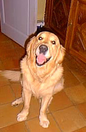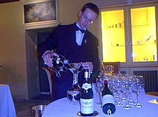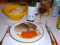 いよいよ、家に入ってテイスティングとディナーです。知的な奥様、広報担当のギー。犬のオーブリオン、猫のミューオも顔を出し、楽しい夕食。メニューはご本人がマルセイユで釣り上げてきたというまぐろ一匹。これをずばり輪切りにして暖炉で焼くという男の料理です。日本びいきのコロンボさんは「一番」の前掛けにお箸のおもてなし。次から次へとワインを開けてくれてワイン談義が続きます。テラコッタの床にオーブリオンが控え、暖炉が赤々と燃えるリビング。庭からはコルナスの街の光と夜のローヌ河が見渡せ、星空の下、最高のひとときを過ごしました。信じたポリシーを曲げることなく、独自のワイン作りに熱い情熱を注いで、充実の時を迎えているコロンボ氏はとても素敵。みんな、すっかり打ち解けて、楽しい宴はなんと12時すぎまで続いたのでした。 |