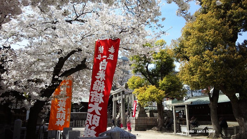 満開の一週間(*^∇^*)ゞ 参拝の人、ご近所の お弁当男子、女子が 特等席で桜を 楽しんだようです。白米稲荷社 例祭の幟もあって 華やかな感じの境内はお昼休み