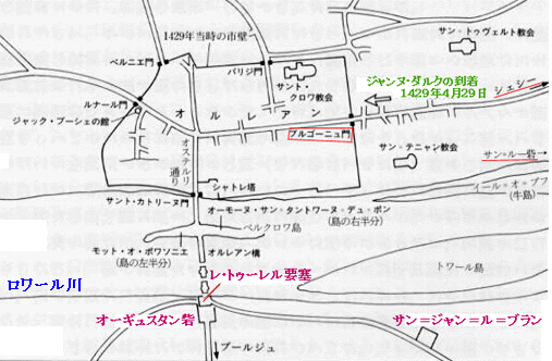 こうして、準備を整えたジャンヌはオルレアンに向かったのである。 そして、ソローニュ方面へと進発して三日目に兵糧を携帯してオルレアン 近くまでやってきて、肉眼で区別できるくらいまで接近したのだった。 |