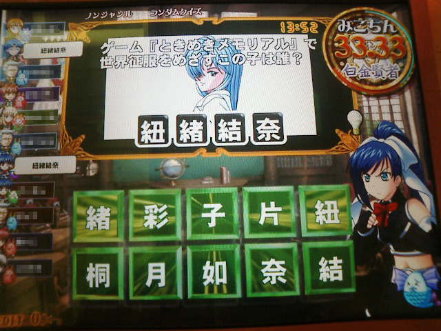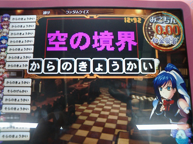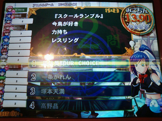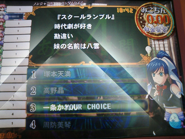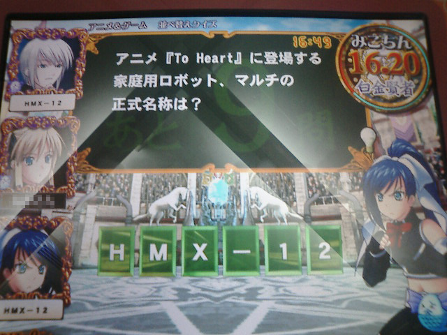 アニメ&ゲーム連想 1個目のヒントを見た後、他のヒントは目に付かず。ちょっと見づらいけど、選択肢の1は周防美琴です。えぇ、間違えてますとも。愛だろ、愛!! |