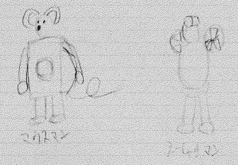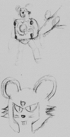 で、採用されたのが「マウスマン」で、(これらは本邦初公開のラフスケッチ(何か偉そう))こっちがイメージスケッチ(ついでに右の方にいるのは「映写機マン」とか言って結局出さなかったやつ)、こっちが最終稿です。