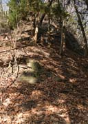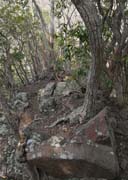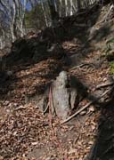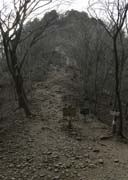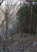 | 今回たどった伊豆ヶ岳東尾根。 紹介した本では「ヤブ山」となっていました。冬場で落葉している点を差し引いても、ヤブはないんじゃないかな。 里山の延長か、歩いている人はいるようで、登りならトレースを迷うような箇所はありません。 が、伊豆ヶ岳山頂に近づくにつれてだんだんと傾斜が急になり、足を滑らしたら、と思うほどでした。 山頂手前のピークは直登せずに一旦左に巻いて右に登るのですが、20m足らずとは言え、それでもやっぱり急坂でした。 伊豆ヶ岳山頂へは直登のコースを採りましたが、ロープがなければ登れなかったんじゃないかなと思います。 山頂までの最後の10mちょっとはロープがなく、落ち葉で滑りそうになって、冷や汗をかきました。 それでも、久しぶりに歩くことを楽しめたコースです。 | |||