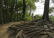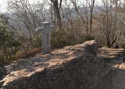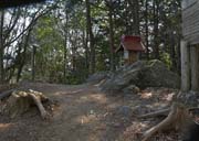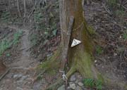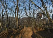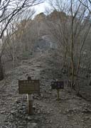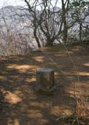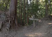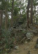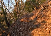 | 子ノ権現にはお参りせずに通過して、駐車場の脇からの細い急降りの路に入ります。 尾根筋の登山道から外れないように注意しながら、いくつかのピークを越えると、ロープで栃屋ノ頭(522mピーク)にたどり着きます。 この付近、尾根の北側は崖なので要注意です。 やがて路は林道に降り着き、しばらく林道を歩いて、前坂への登り口へ。 山腹をたどって尾根に戻れば少しで前坂の十字路でした。天覚山どころか大高山までもまだ遠く・・・。 尾根路を進んで大岩を回り込み、ダンダンダンとピークを越えて、最後の急坂を登り詰めると、見覚えのある天覚山手前の広場でした。 | |||