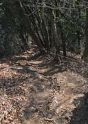 | 伊豆ヶ岳を後に、山伏峠への路を分け、急坂を下って登り返したところが古御岳山。 高畑山、中ノ沢頭、と急登と急降下を繰り返しながら、天目指峠を横切りました。 路が少しだけやさしくなって、三つばかり小さな高みを過ぎ、竹寺への分岐を分けると、しばらくで子ノ権現が見えてきます。 そのごく手前で、尾根の南面に日向ぼっこに相応しい空き地?があったので、ここで休憩・中食としました。 | |||